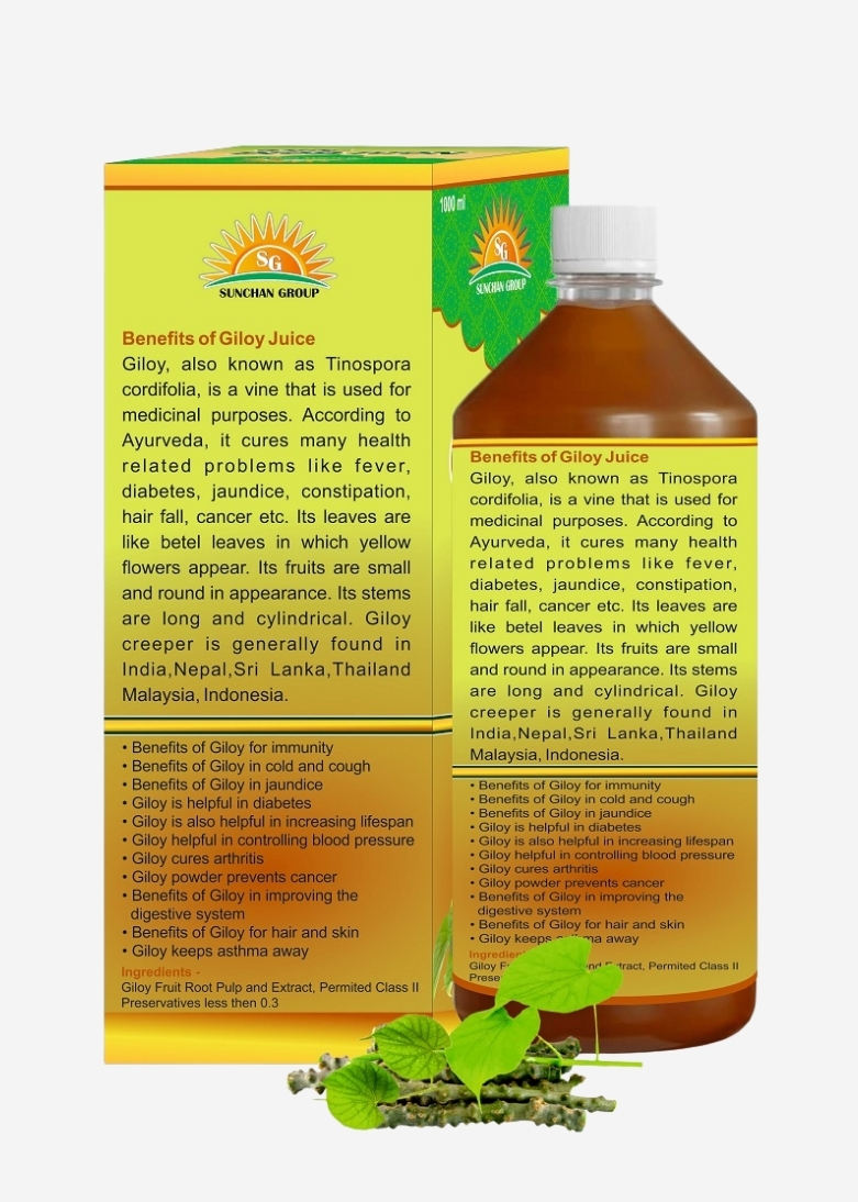 Benefits of Giloy Juice  Giloy, also known as Tinospora cordifolia, is a vine that is used for medicinal purposes. According to Ayurveda, it cures many health related problems like fever, diabetes, jaundice, constipation, hair fall, cancer etc. Its leaves are like betel leaves in which yellow flowers appear. Its fruits are small and round in appearance. Its stems are long and cylindrical. Giloy creeper is generally found in India,Nepal,Sri Lanka,Thailand Malaysia, Indonesia.